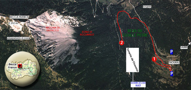 Raggiunta la frazione di Thouraz, è consigliabile attraversare il piccolo abitato, che ospita attualmente un grazioso ranch, e proseguire per un centinaio di metri in direzione W, dove è possibile osservare la frana nella sua interezza.