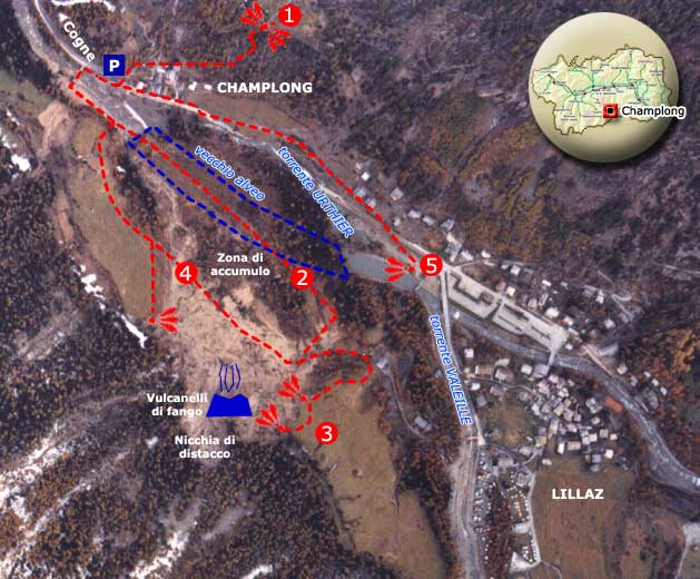 Pour une visite plus détaillée, retourner sur la route goudronnée et passer le pont en bois qui enjambe le torrent Urtier quelques mètres sous le parking ; en prenant tout de suite à gauche, on emprunte la piste de ski nordique qui a été reconstruite. On accède ainsi directement aux bords de l'éboulement, où les mélèzes sont inclinés et la couverture végétale désarticulée.