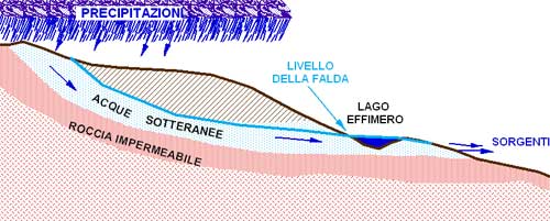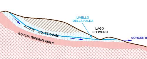 Nell’immagine inferiore lo schema mostra, durante un periodo più “asciutto”, il probabile andamento della falda che continua ad alimentare le sorgenti verso valle ma che non riesce più a colmare la depressione del Lago.