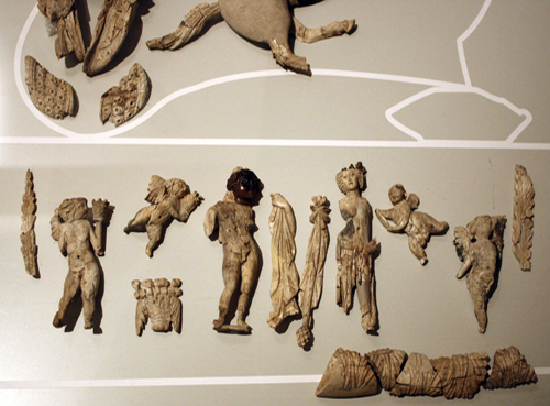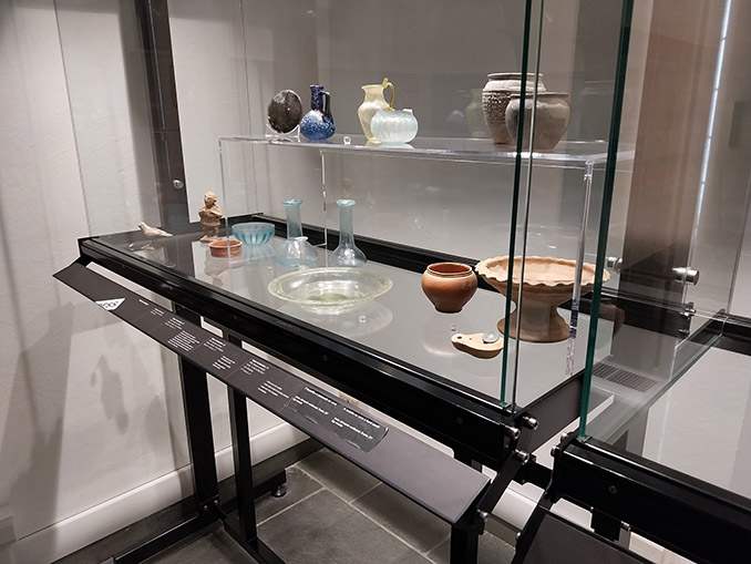 Provenant des fouilles et de la collection du chanoine Pierre-Louis Vescoz (1840-1925) de la Société de la Flore Valdôtaine, les éléments présentés dans les vitrines de cette section sont, en effet, de différentes natures: un abaque, quelques ustensiles d’écriture, des statuettes, des lampes à huile, ainsi que des objets du quotidien en céramique et en verre.