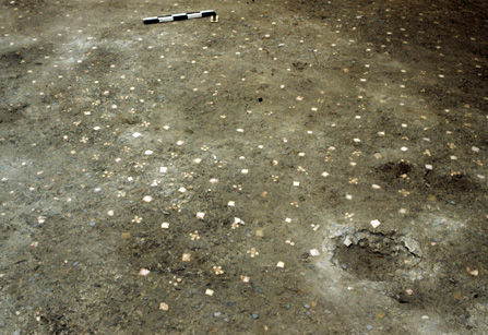 La decorazione pavimentale di questa stanza della villa è in opus sectile su sottofondo in opus signinum (impasto di calcestruzzo e laterizio pestato di colore rosato): nel campo è ripetuto un motivo geometrico formato da un rombo inscritto in un quadrato delimitato da rettangoli e quadrati più piccoli agli angoli. Nella tecnica dell'opus sectile (da seco: "taglio") lastre di marmo di varia forma, dimensione e colore vengono accostate a formare motivi decorativi.