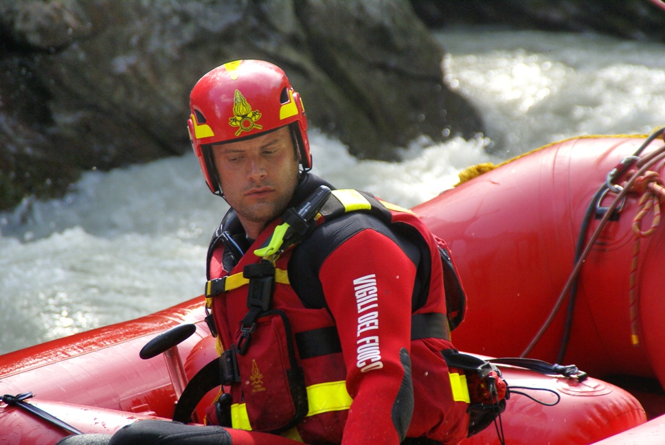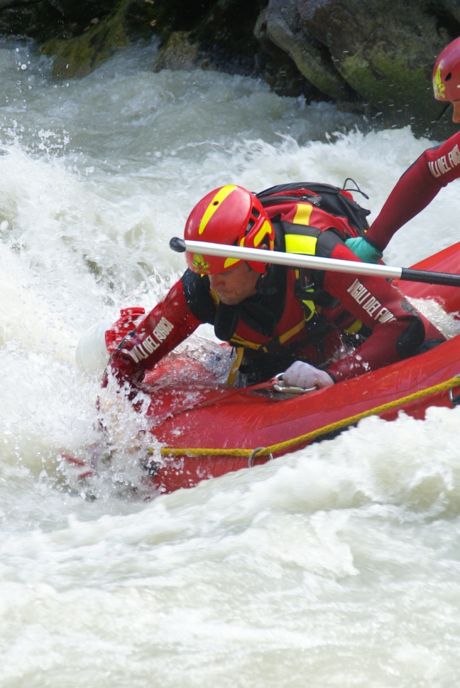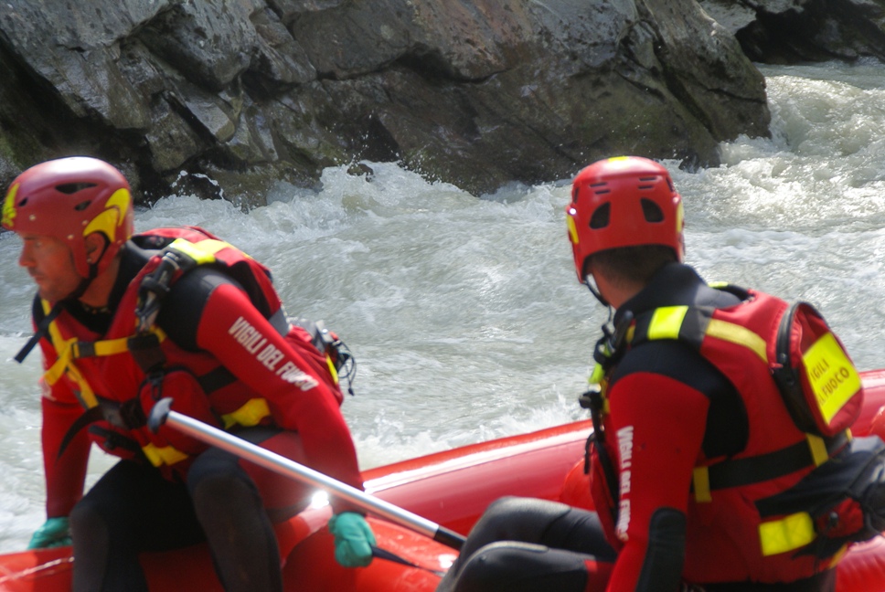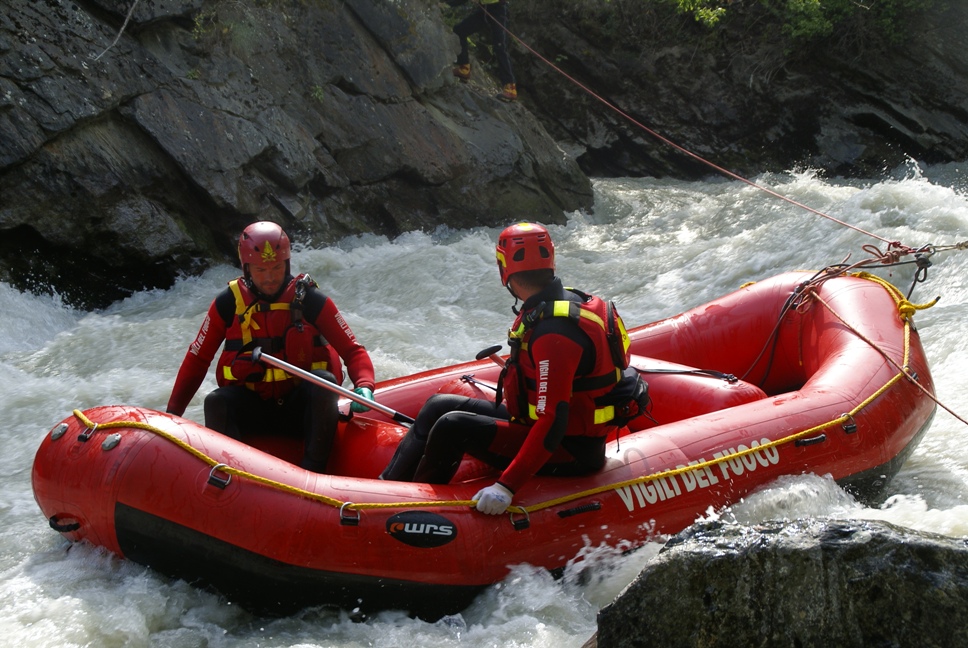 Di seguito le immagini relative ad un intervento per soccorso persona sul fiume Dora nel periodo estivo, quando la portata del corso d'acqua č importante. A causa della corrente, nella fattispecie, č stato necessario costruire una tirolese (una carrucola), per permettere al gommone da rafting dei vigili del fuoco di essere posizionato da altri operatori in mezzo al corso d'acqua in modo stabile e consentire ai soccorrritori di operare. La particolare conformazione accidentata dell'alveo del fiume crea parecchi rulli e vortici che rendono precario l'equilibrio dei soccoritori e le operazioni ancora pių difficili.