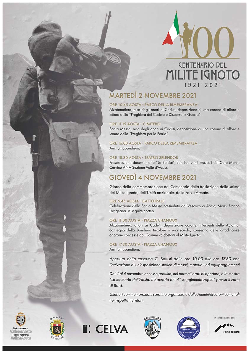 22/10/2021 - Martedì 2 novembre, al cimitero di Aosta le commemorazioni dei caduti in guerra. Giovedì 4 novembre, in piazza Chanoux gli eventi celebrativi per il centenario della traslazione della salma del Milite Ignoto, Giorno dell'Unità nazionale e Giornata delle Forze Armate