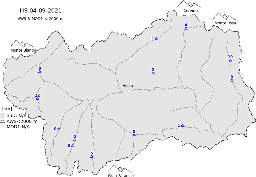 Snow depth + automatic weather station data (AWS) + Modello 1 AINEVA (MOD1) data below 2000 m
