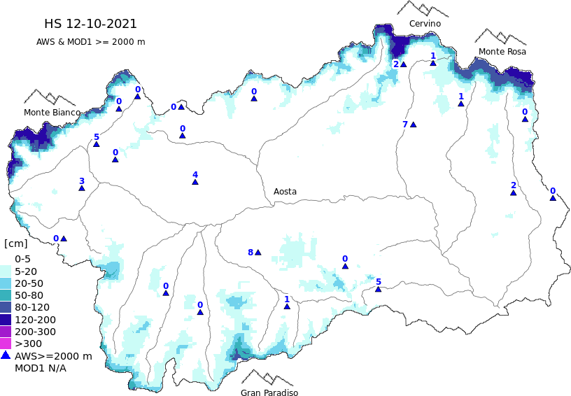 Altezza neve al suolo + dati stazioni automatiche (AWS) e Modelli 1 AINEVA (MOD1) oltre i 2000 m