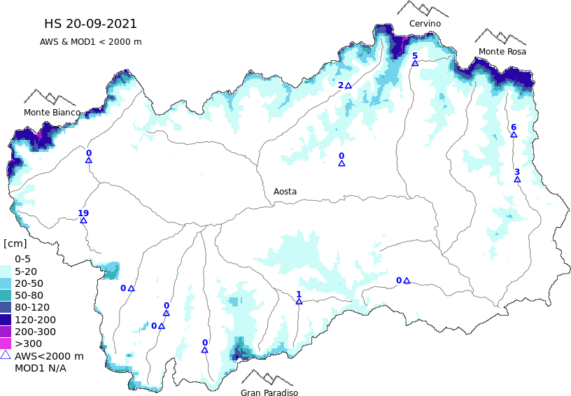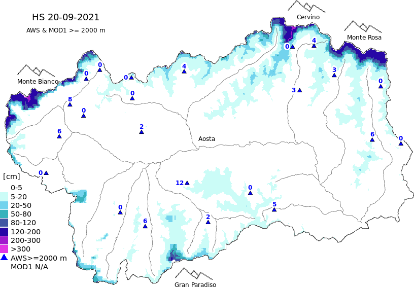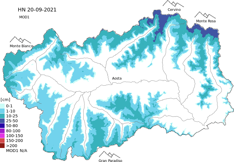 Altezza neve al suolo + dati stazioni automatiche (AWS) e Modelli 1 AINEVA (MOD1) oltre i 2000 m