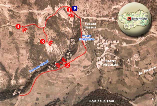 La discesa offre anche una splendida visione frontale sui calanchi. Risaliti alla strada asfaltata si può proseguire ancora per una decina di metri fino ad arrivare ad un piccolo piazzale, da dove si apre un meraviglioso scorcio panoramico su tutta l'incisione e sul paese di St-Nicolas.