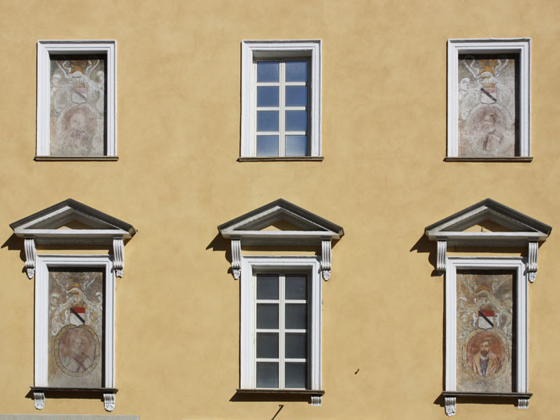 La facciata attuale è quella della caserma, con dipinti del XIX secolo che riproducono lo stemma di casa Savoia e i ritratti dei principali personaggi della nobile famiglia Challant, distintisi per le loro doti militari.