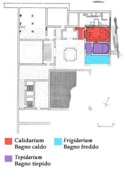 A un vestiaire (apodyterium), impossible à localiser avec certitude, fait suite un tepidarium, local à la température modérée d'où l'on passe dans le calidarium, avec deux vasques d'eau chaude sur les côtés courts, une rectangulaire, l'autre semi-circulaire; la haute température est garantie ici par un système de diffusion de l'air au moyen d'un hypocaustum situé sous le sol et de conduites en brique (tubuli), appuyées contre les murs.