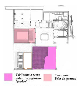 Gli spazi rettangolari, delimitati da una fila di tessere sul pavimento, esprimono l'etimologia stessa del nome triclinium, dai tre letti (klinai), appunto, disposti a ferro di cavallo nella sala da pranzo, sui quali nel mondo romano si consumavano i pasti, almeno nelle occasioni più importanti.