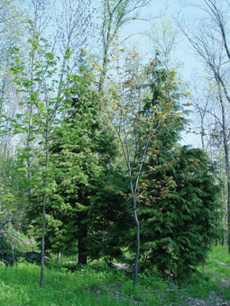 On y trouve des épicéas, des mélèzes, des pins sylvestres, des pins noirs, des douglas, des cèdres, des thuyas, des robiniers, des cerisiers, des frênes communs et des ornes, des ormes, des érables, des tilleuls, des chênes, des noyers, des bouleaux, des peupliers, des châtaigniers, des sureaux noirs, des poiriers et des pommiers sauvages, des églantiers, des genévriers, etc….