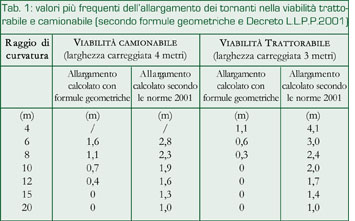 Nella tabella sono altresì riportati i valori di allargamento in curva della carreggiata previsti dal Decreto ministeriale LL.PP. 5 novembre 2001, valori che tuttavia non sono obbligatoriamente applicabili nelle strade di montagna e in quelle a carattere agrario-forestale.
