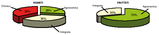 È evidente che l’obiettivo principale del coltivatore è la produzione agricola, non la biodiversità nel suo vigneto o frutteto; è altrettanto evidente, però, che le sue scelte nella gestione di queste superfici hanno anche conseguenze sull’ambiente. Ad esempio, gli interventi di controllo delle malerbe hanno un effetto diretto sulla flora spontanea, sull’entomofauna legata a determinate specie vegetali o sulla possibilità di spostamento al suolo degli insetti non alati. Sull’insieme delle colture studiate, sono stati rilevati tre tipi di gestione del suolo: il diserbo chimico su tutto l’appezzamento, la gestione agronomica, basata solo sul controllo meccanico delle infestanti (con la lavorazione del suolo o lo sfalcio), e la gestione integrata, che associa il diserbo chimico sotto il filare a quello meccanico tra i filari. Rispettivamente, le tre tecniche di gestione interessano il 36%, il 28% e il 36% delle superfici studiate nei vigneti, mentre nei frutteti prevale la gestione agronomica e il diserbo chimico non è stato rilevato (Fig. 2).