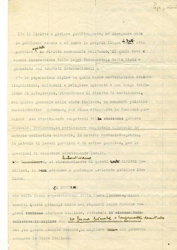 Dichiarazione dei diritti delle popolazioni alpine (testo preliminare presentato alla riunione di Chivasso, con le correzioni a mano dell’autore, Emile Chanoux)