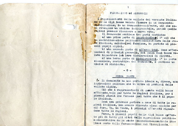 1944 – Emile Chanoux, Federalismo ed Autonomie (testo ciclostilato, con correzioni a mano dell’autore).