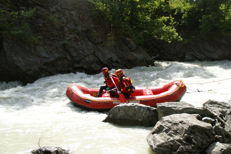 Di seguito le immagini relative ad un intervento per soccorso persona sul fiume Dora nel periodo estivo, quando la portata del corso d'acqua č importante. A causa della corrente, nella fattispecie, č stato necessario costruire una tirolese (una carrucola), per permettere al gommone da rafting dei vigili del fuoco di essere posizionato da altri operatori in mezzo al corso d'acqua in modo stabile e consentire ai soccorrritori di operare. La particolare conformazione accidentata dell'alveo del fiume crea parecchi rulli e vortici che rendono precario l'equilibrio dei soccoritori e le operazioni ancora pių difficili.